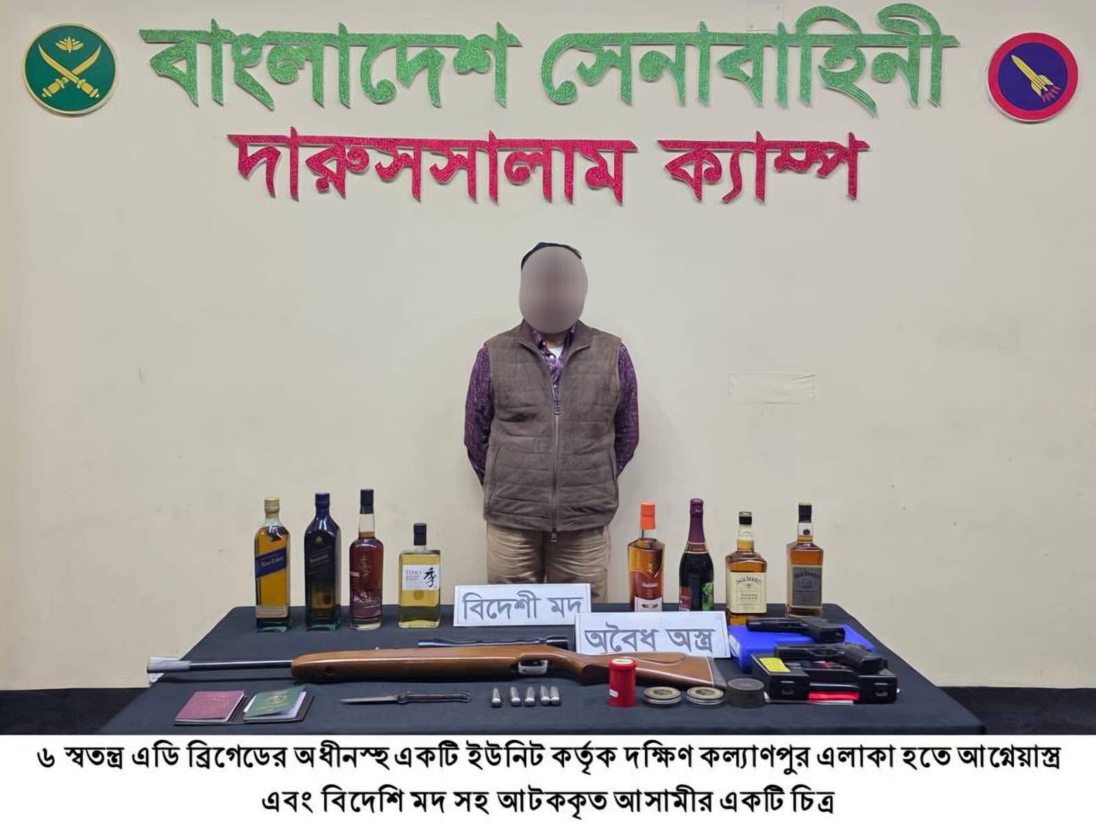 এ সময় মোঃ নাসির উদ্দিন (৬৫) নামে এক ব্যক্তিকে আটক করা হয়। তার কাছ থেকে ১টি .২২ রাইফেল, ২টি বিদেশি পিস্তল ও বিদেশি মদের বোতলসহ বিভিন্ন সরঞ্জাম উদ্ধার করা হয়।