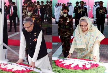 জাতির পিতা বঙ্গবন্ধু শেখ মুজিবুর রহমানের ১০৪তম জন্মবার্ষিকী ও জাতীয় শিশু দিবসে বঙ্গবন্ধুর সমাধিতে পুস্পস্তবক অর্পণ করে শ্রদ্ধা জানিয়েছেন রাষ্ট্রপতি মো. সাহাবুদ্দিন ও প্রধানমন্ত্রী শেখ হাসিনা।